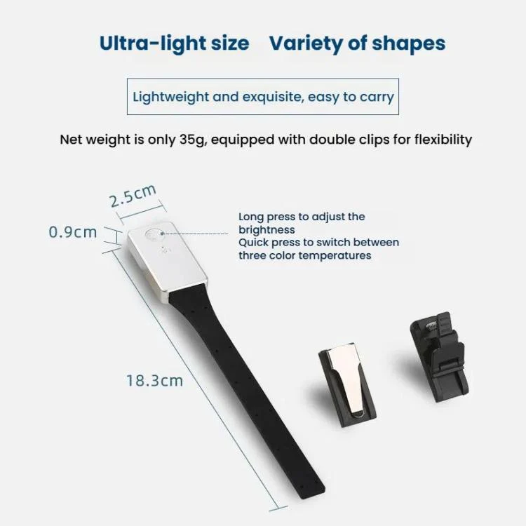7. Various shapes, equipped with double clips, more flexible to use, the large clip can be used to clip e-books for auxiliary lighting, and the small clip can be inserted into paper books