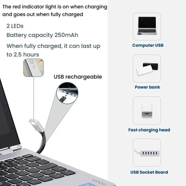 6. USB rechargeable, red indicator light is on when charging, and turns off when fully charged, the brightest time is about 2.5 hours when fully charged
