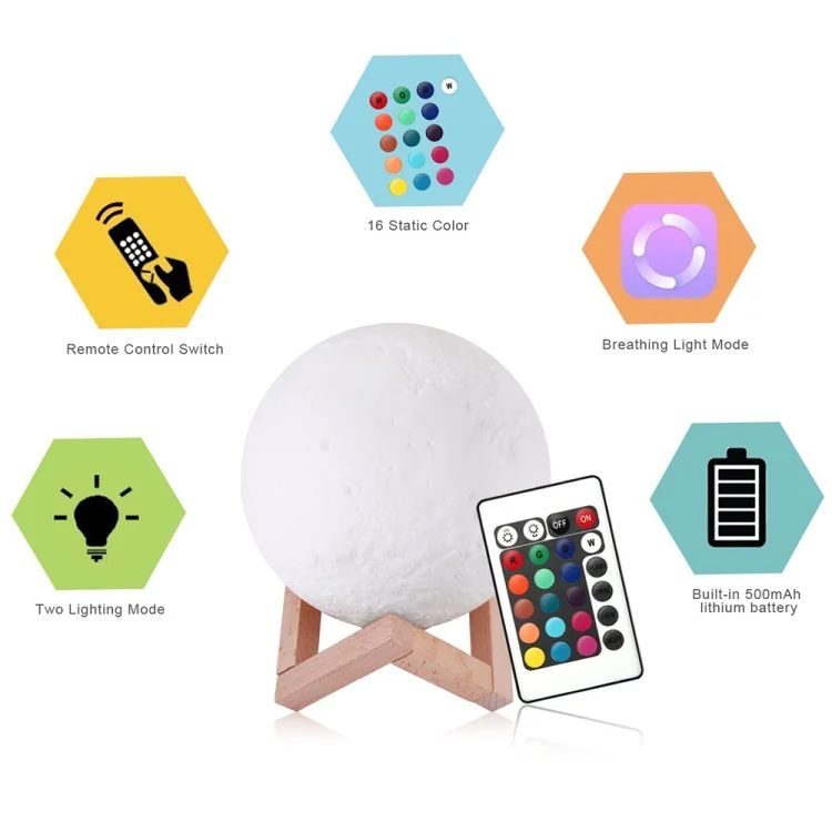 YouOKLight YK2302 15cm Touch Control 3D Print Moon Lamp, USB Charging 16-Color Dimming LED Night Light with Remote Control & Wooden Holder