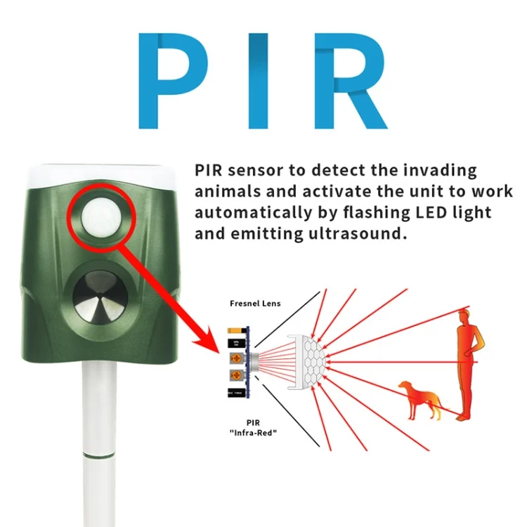 4. PIR sensor to detect the invading animals and activate the unit to work automatically by flashing LED light and emitting ultrasound.