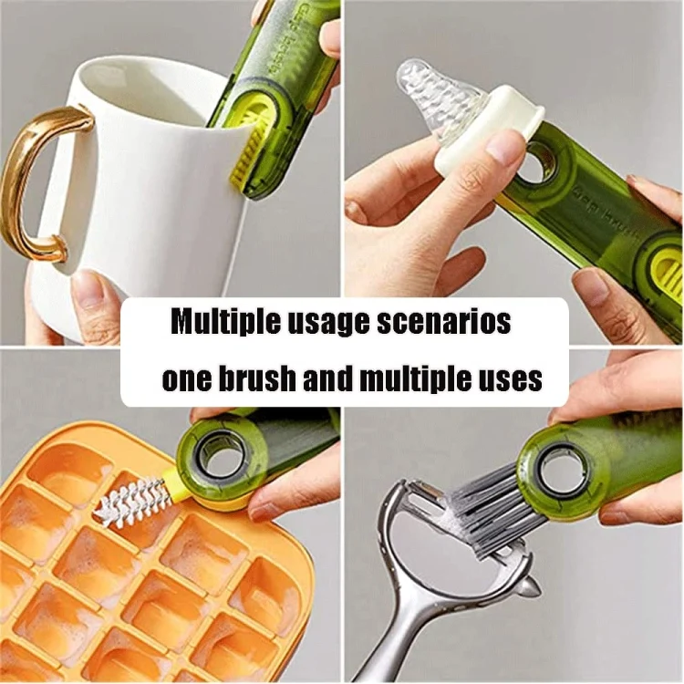 1. Three-in-one: 1. U-shaped brush: fits around the mouth of the cup to clean stubborn stains. 2. Crevice Brush: Clean the narrow grooves on the inside of the cover. 3. Hard-bristle corner brush: remove dirt from the corner grooves of the container.