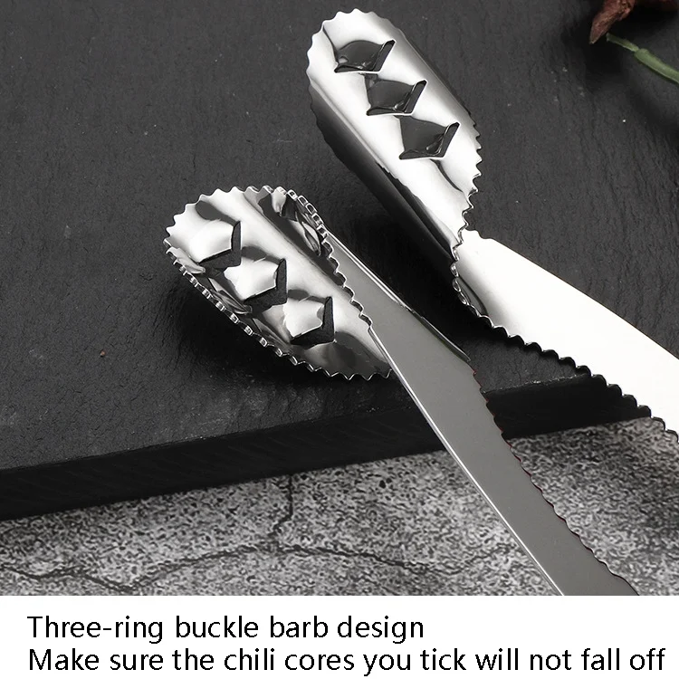 3. Features: rotating sharp serrations, easy to use and not hurting hands, stainless steel cylindrical frosted handle, comfortable grip, three-ring buckle barb design, to ensure that the hooked chili core will not fall off