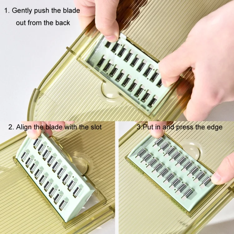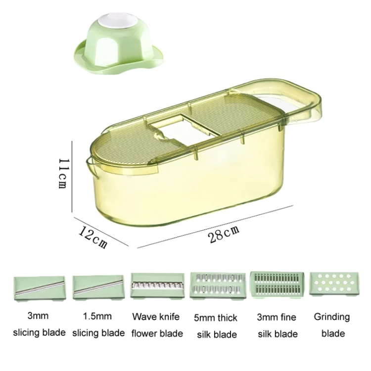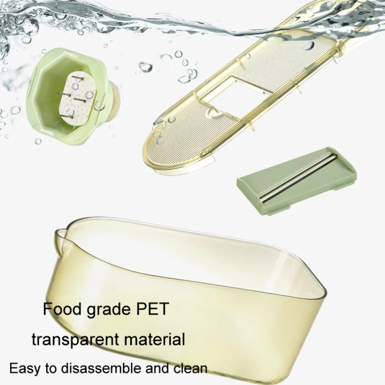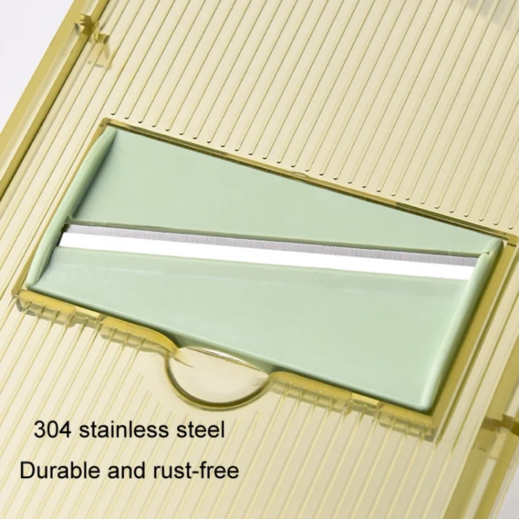 1. Material: cutting board: ABS, hand guard: PP+304 stainless steel, friction pad: TPR, slicing blade: ABS+420, shredding blade: ABS+430, body: PET
