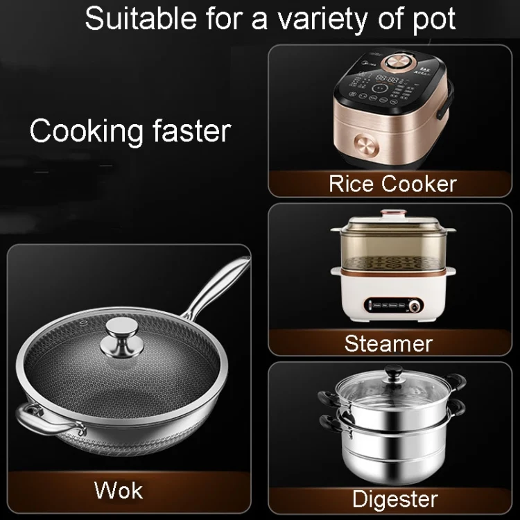 7. Three steam boxes with lids are suitable for pots and pans with a diameter of more than 21cm; three steam boxes without lids are suitable for pots and pans with a diameter of more than 22cm