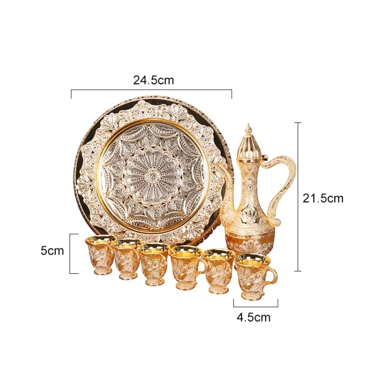 2. Dimensions: plate diameter 24.5 cm, hip flask height 21.5 cm, wine glass 4.5×5 cm
