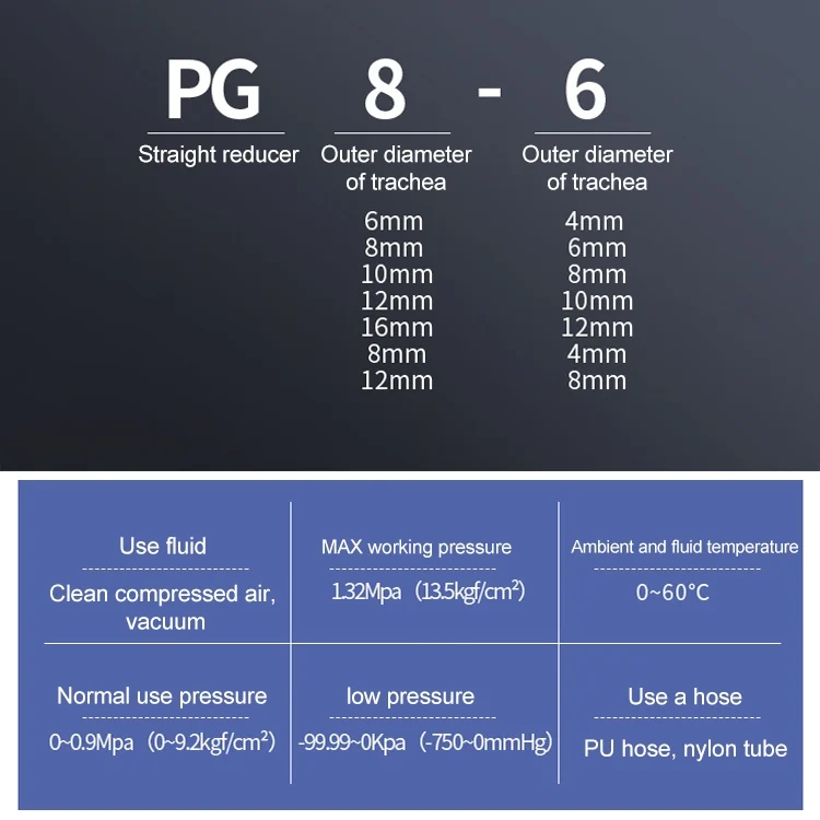 PG6-4 ,PG8-4 ,PG8-6 ,PG10-6 ,PG10-8 ,PG12-8 ,PG12-10 ,PG16-12 |