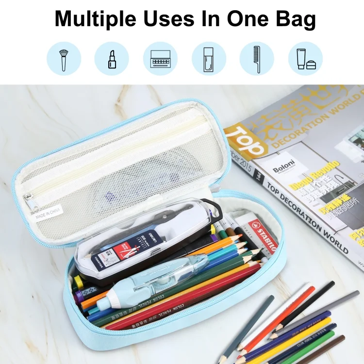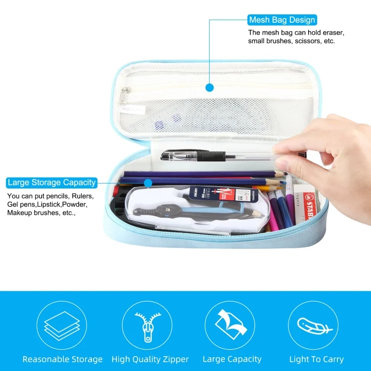 1. Premium fabric: Large-capacity pencil holder bag is made of high-quality fabric, is strong and durable.