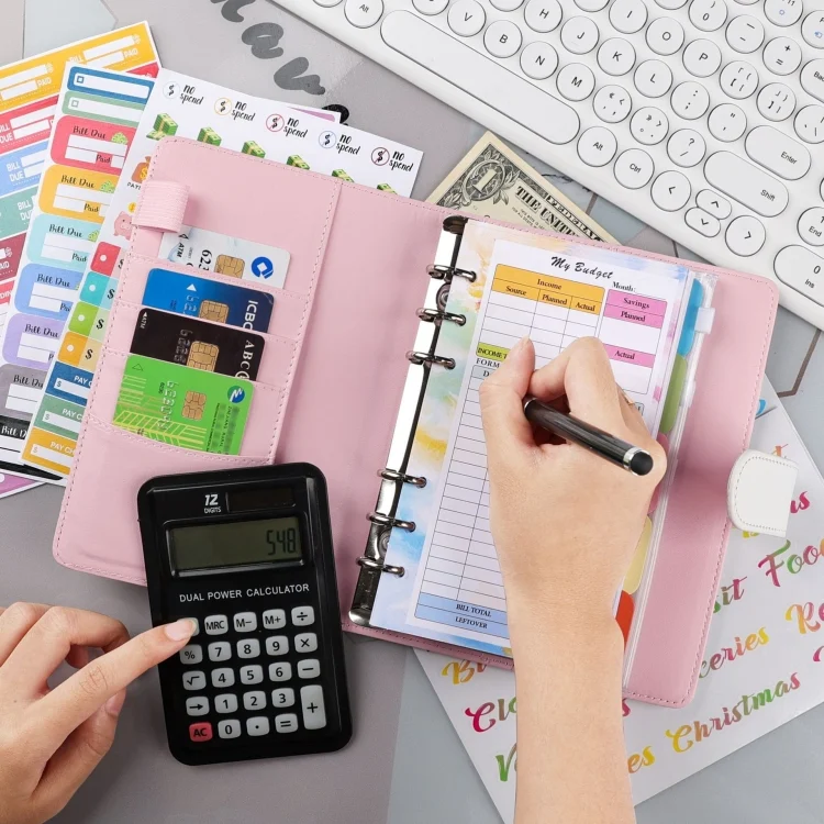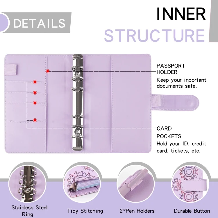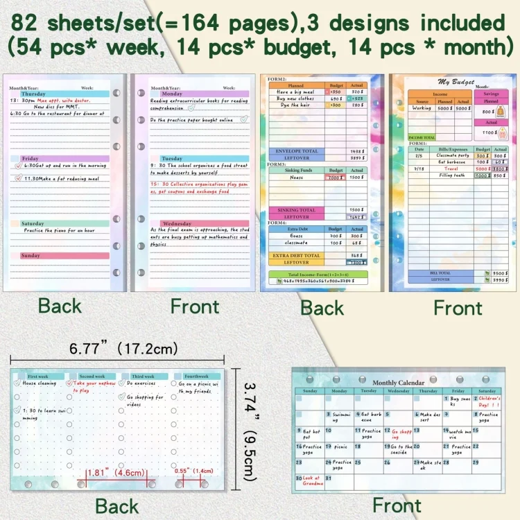 6. Set contains: 1 shell + 54 weekly plans + 14 monthly plans + 14 colorful budget pages + 3 money stickers + 3 colorful English stickers + 4 zipper pockets