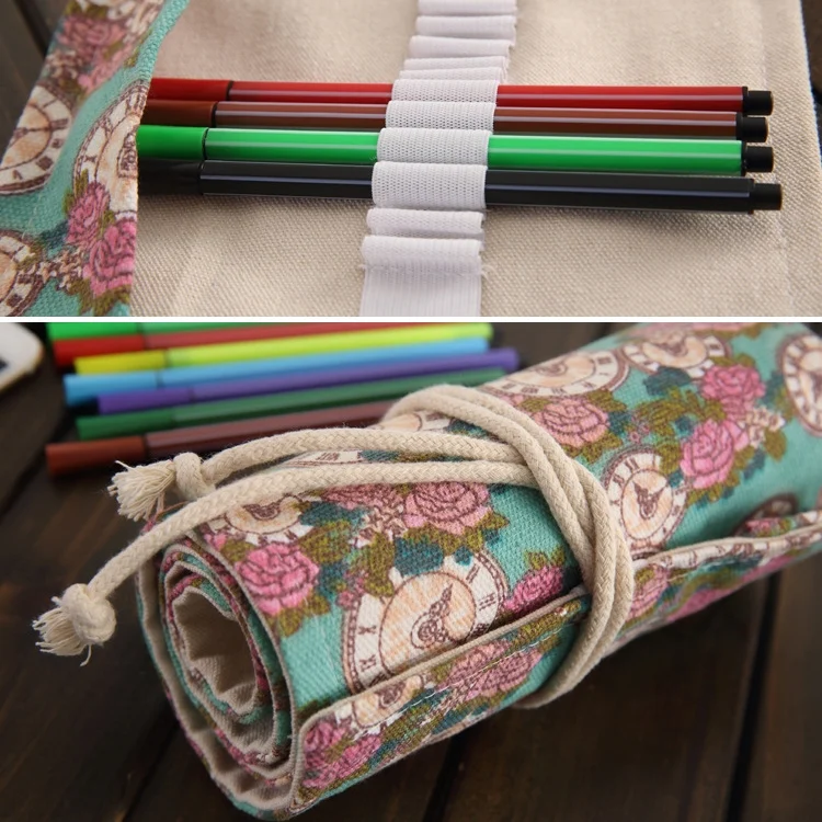 36 Slots Rose Clock Print Pen Bag Canvas Pencil Wrap Curtain Roll Up Pencil Case Stationery Pouch