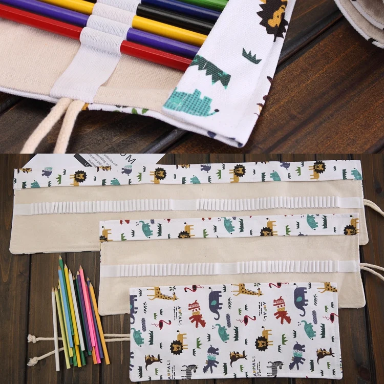 48 Slots Cartoon Animal Print Pen Bag Canvas Pencil Wrap Curtain Roll Up Pencil Case Stationery Pouch