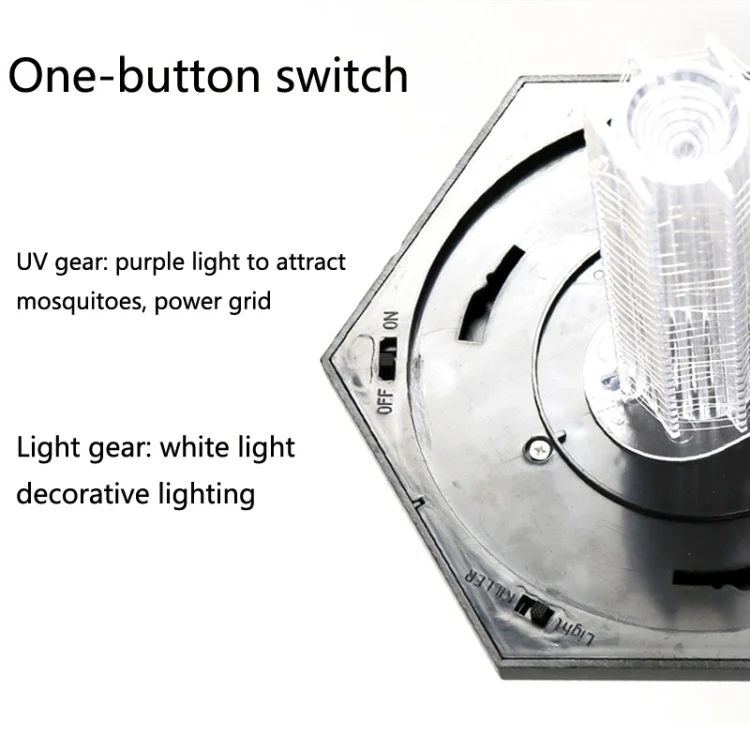5. One-button switch, UV gear: purple light to attract mosquitoes, power grid; Light gear: white light decorative lighting