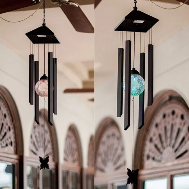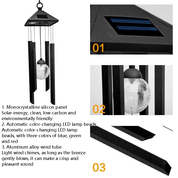 11. Features: energy saving and consumption reduction, high conversion rate of solar panels, low carbon and environmental protection, automatic color-changing LED lamp beads, blue, green and red, aluminum alloy wind chimes, durable, waterproof and rainproof, wide applicability