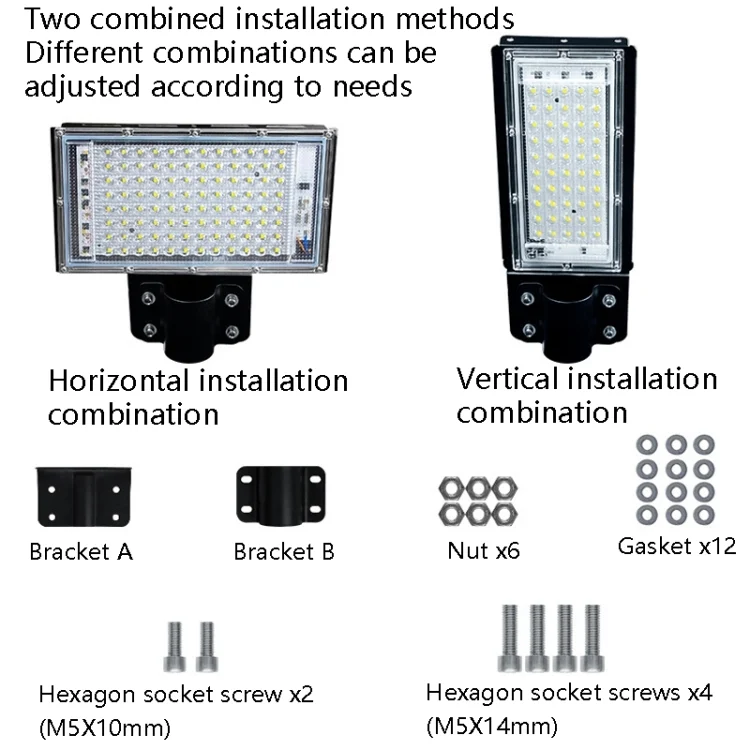 9. Packing list: lamp x1, bracket x2, nut x6, washer x12, hexagon socket screw (M5X10mm) x2, hexagon socket screw (M5X14mm) x4