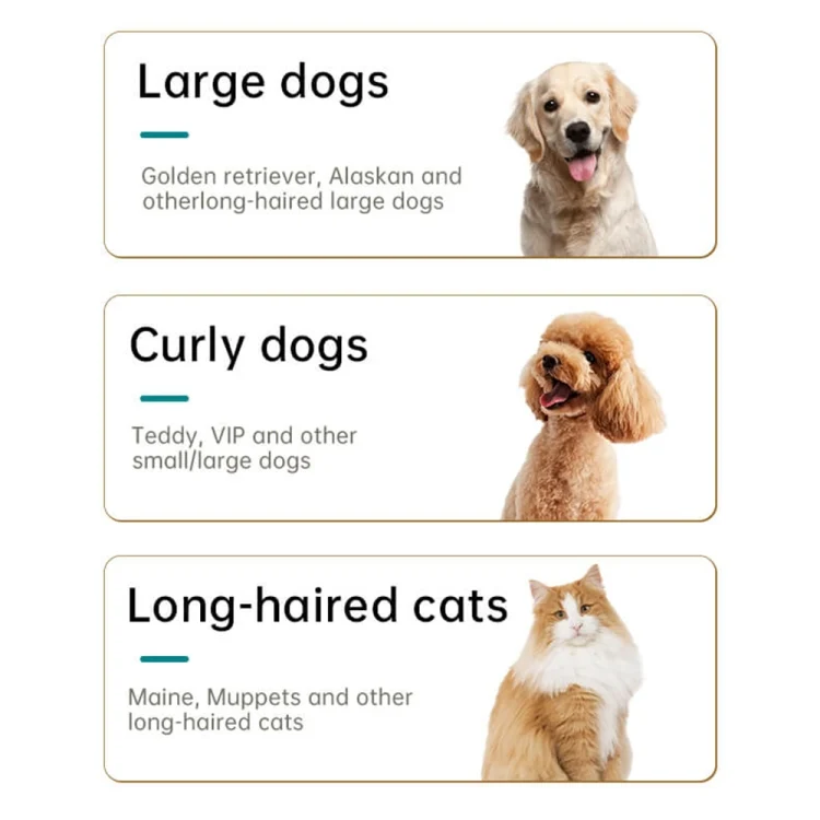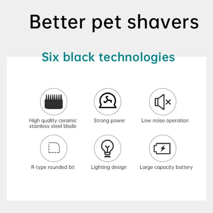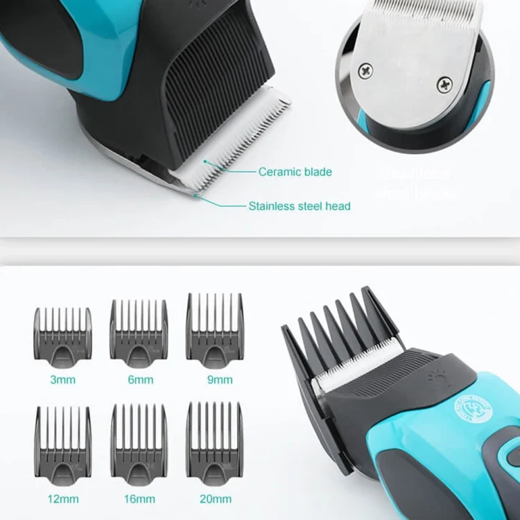 7. Accessories: 6 guide combs, cleaning brush, pet comb, USB charging cable, user manual