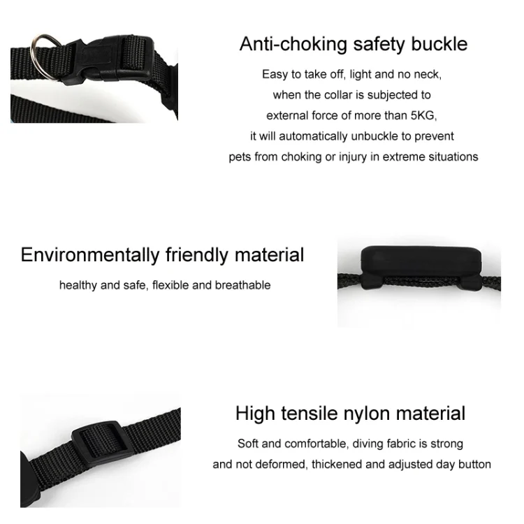13. The anti-suffocation safety buckle is easy to put on and take off, light and does not strangle the neck. When the collar is subjected to an external force exceeding 5KG, it will automatically release to prevent pets from suffocating or being injured in extreme situations.