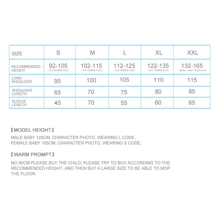 2.Size and weight: we provide size from S to XXL (length: 95-115cm), for children height from about 90 to 165cm, weight is about 300g