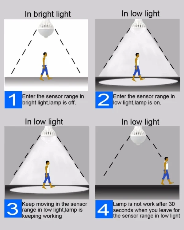 2. Smart time delayed: bulb will automatic on 25 seconds after sensor human motion, in the bulb”s working time, if human keep in the range of induction, the bulb will still on, until the human leave the sensor area, the bulb will off