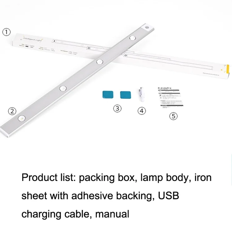 19. Product list: packing box, lamp body, iron sheet with adhesive backing, USB charging cable, manual
