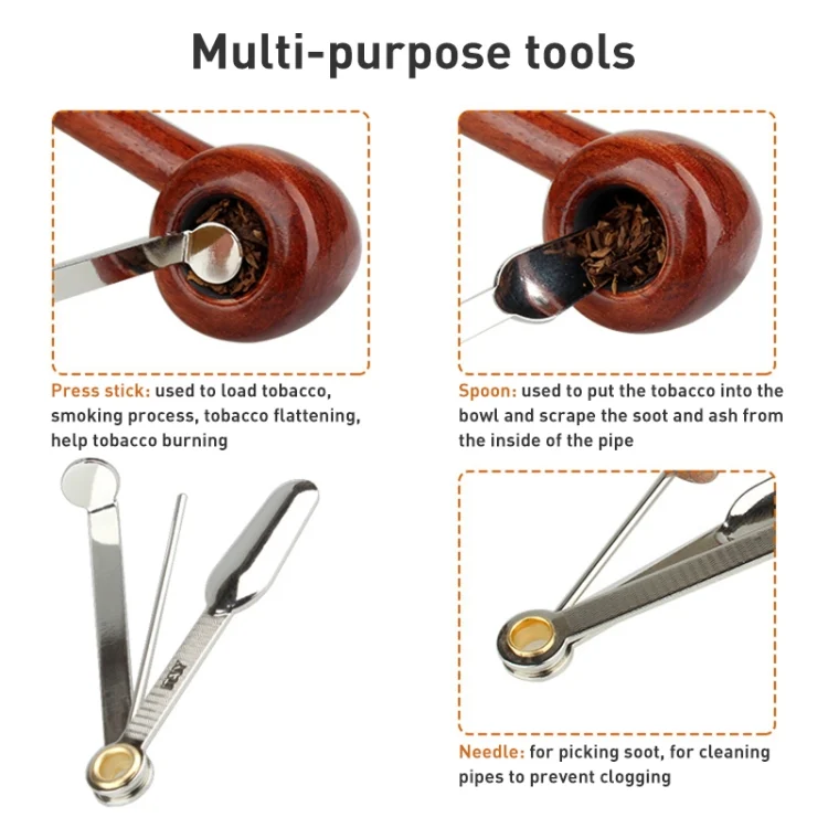 4. Usage: The scraper cleans the soot in the bucket, and then presses the tobacco; the needle is used to clear the blockage of the flue; the pressing rod is used to load the shredded tobacco