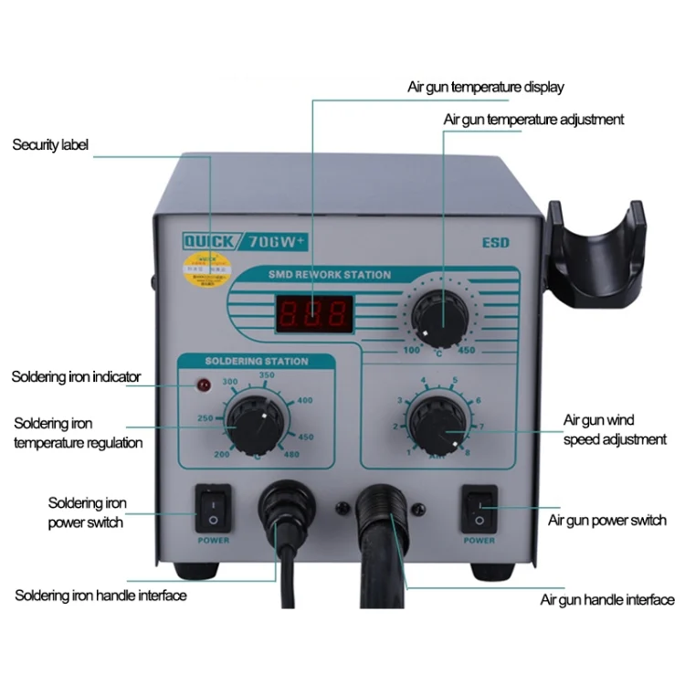 2 in 1 QUICK 706W+ 220V 50W Digital Display Hot Air Gun Anti-static Constant Temperature Lead-free Soldering Iron Desoldering Station, AU Plug
