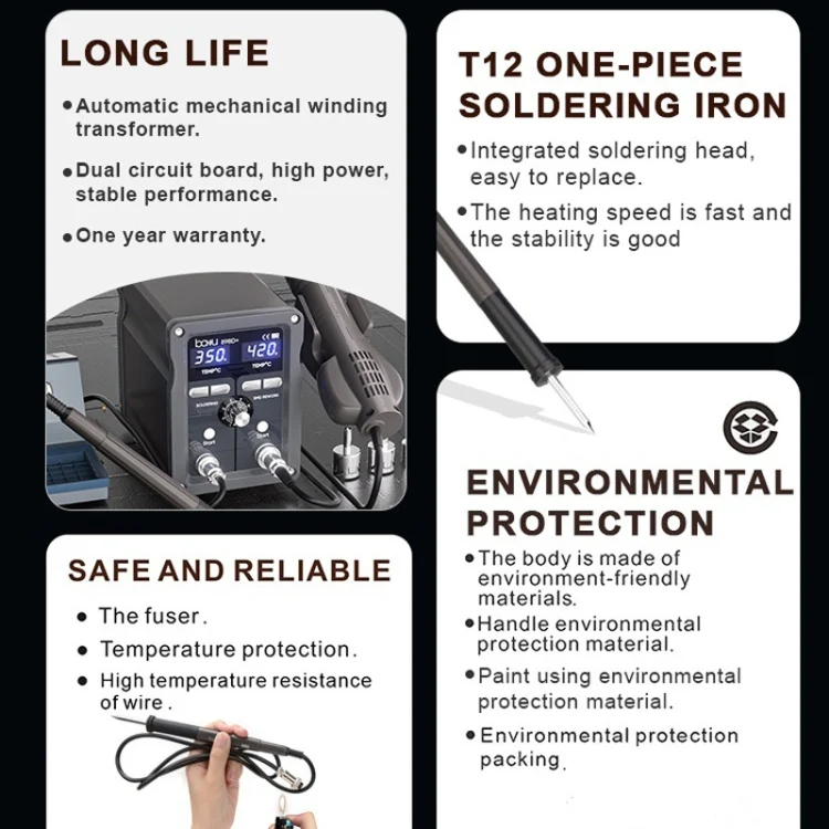 1. BA-898D+ Digital Display Hot Air Gun Electric Soldering Iron Two-in-One Repair Soldering Station, designed for mobile phone and computer motherboard repair. This product has a digital display function and can provide constant temperature control, suitable for delicate electronic repair work. It is designed to improve work efficiency while ensuring the quality of repair.
