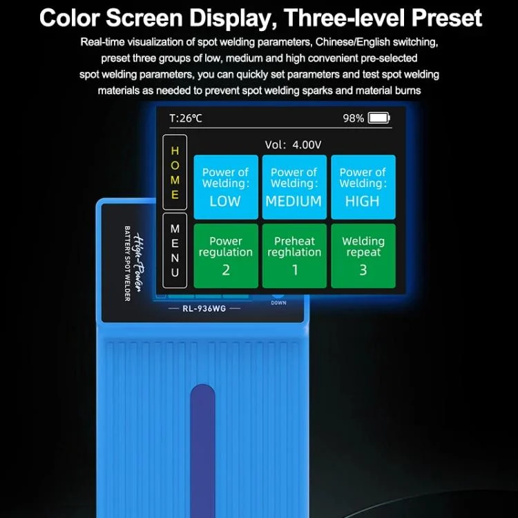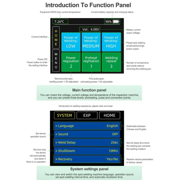5. Main function panel: Displays spot welder power supply, current voltage, and temperature. Pre-sets three modes: preheating, pulse, and continuous spot welding