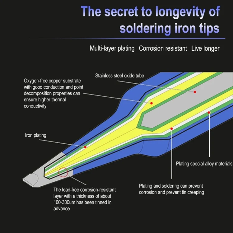 – This can reduce the oxidation chance of the welding head and make the welded iron head more durable. After use, the new tin layer should be coated only after the humidity of the solder iron is slightly reduced, and the right-to-use tin plating layer can achieve better anti-oxidation effect.