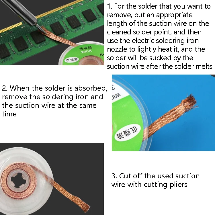 1. For the solder that you want to remove, put an appropriate length of the suction wire on the cleaned solder point, and then use the electric soldering iron nozzle to lightly heat it, and the solder will be sucked by the suction wire after the solder melts