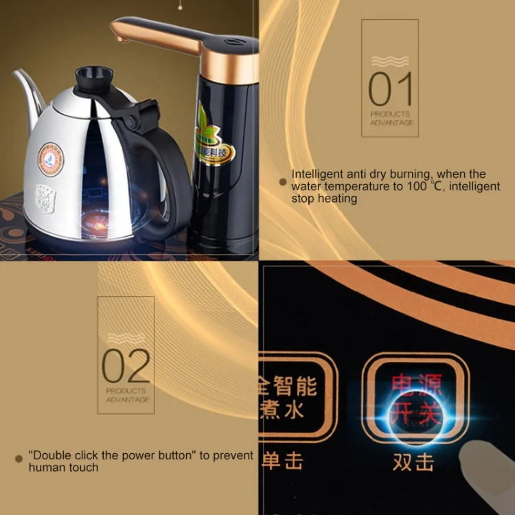 6. Features: beautiful and practical, double-click anti-touch function, the built-in temperature sensor chip can display the water temperature when plugged in, gravity automatically rotates the water supply device, automatically returns to position after being filled with water, the material is healthy and not easy to rust, when the water temperature is boiled to Automatically stop heating at 100 degrees Celsius, automatically shut down after 30 minutes of no operation, safe to use, easy to clean, high temperature resistant, durable