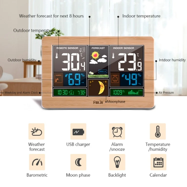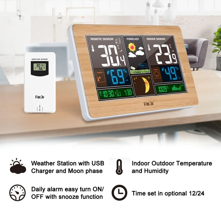 FUJU Wood Grain Weather Station Digital Clock Alarm Thermometer Hygrometer