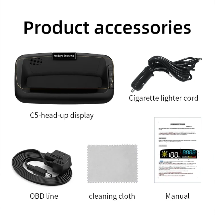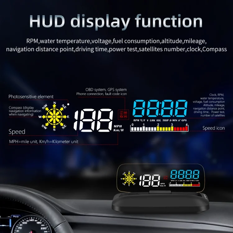 1. HUD short for Head Up Display,the main function is to display the car dashboard information (e.g.speed, RPM, water temperature, voltage, trip distance etc ), and keep the driver eyes always on road to avoid the dangerous of lowering down head to read the dashboard.