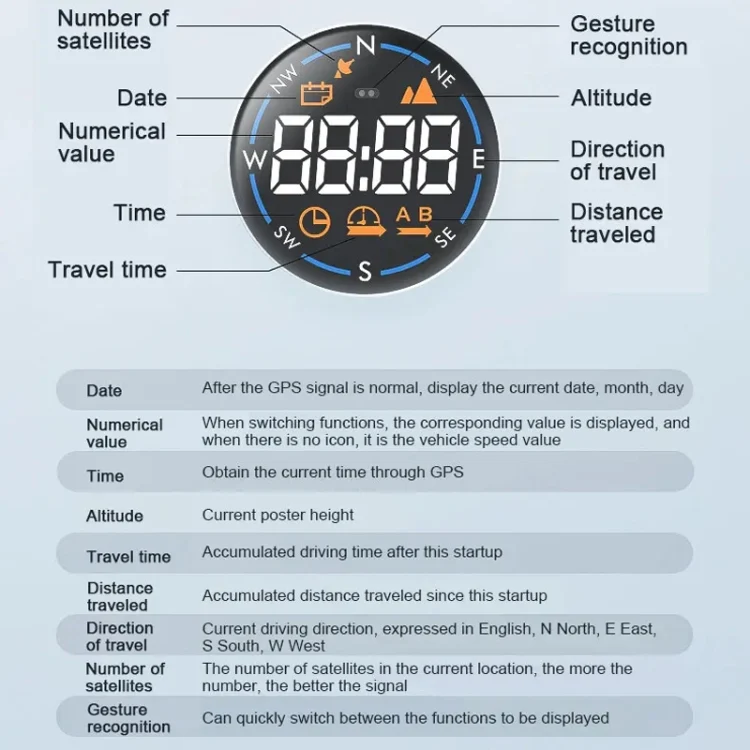 1. Date: after the GPS signal is normal, the current date, month and day are displayed