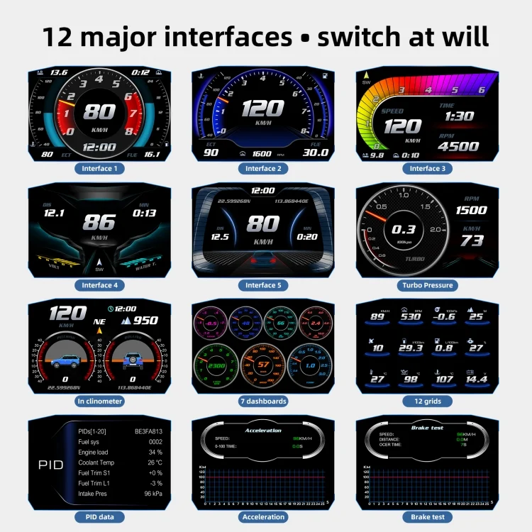 Function: vehicle speed, voltage, water temperature, oil temperature, transmission oil temperature, turbo pressure, instantaneous fuel consumption, average fuel consumption, exhaust temperature, fuel quantity, driving distance, driving time, altitude, number of satellites, rotational speed, intake air Temperature, oil pressure, fuel pressure, GPS accuracy, date, accelerometer, latitude and longitude, driving direction, engine load, power battery power, left and right tilt angle, front and rear pitch angle, acceleration test, brake test, fault detection, clear fault code