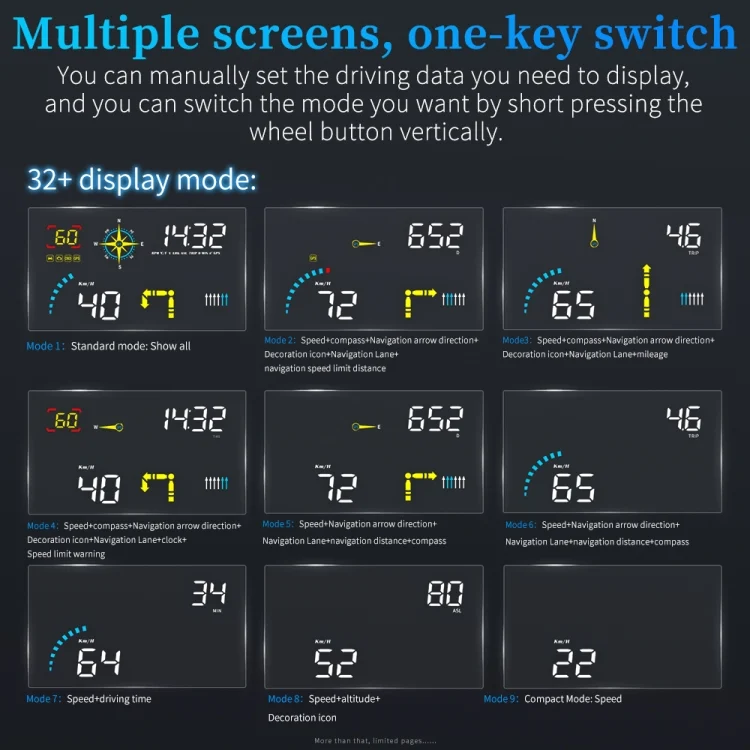 8. Multi function display area: speed, water temperature, voltage, fuel consumption, altitude, mileage, navigation distance, driving time ,Power test, number of satellites, clock