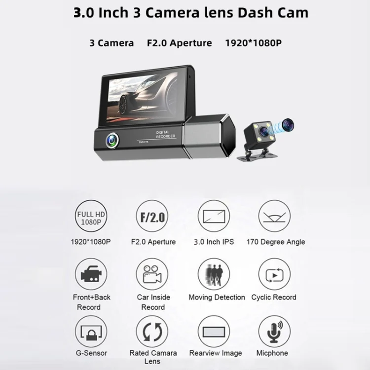 3 Lens Video HD 1080P Multi-Language Driving Recorder