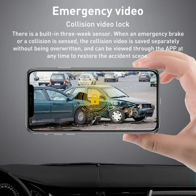 2. Built-in three-axis sensor, when the sensor brakes in an emergency or a collision occurs, the collision video is saved separately and will not be overwritten, and can be viewed through the APP at any time to restore the scene of the accident.