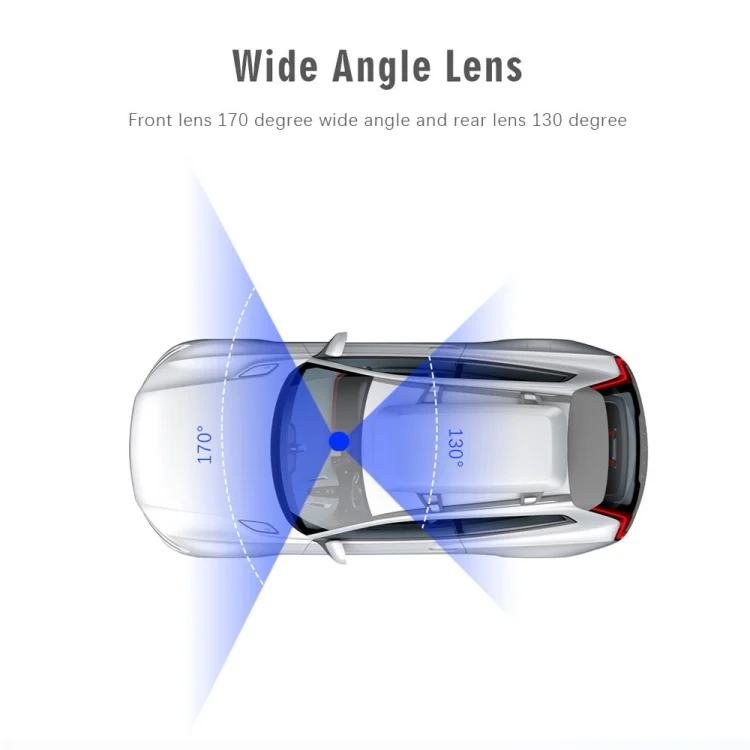 1. 170-degree wide angle front lens and 130-degree rear lens, the wide angle provides a panoramic view of the front and rear of the car so that you can see more details on the screen