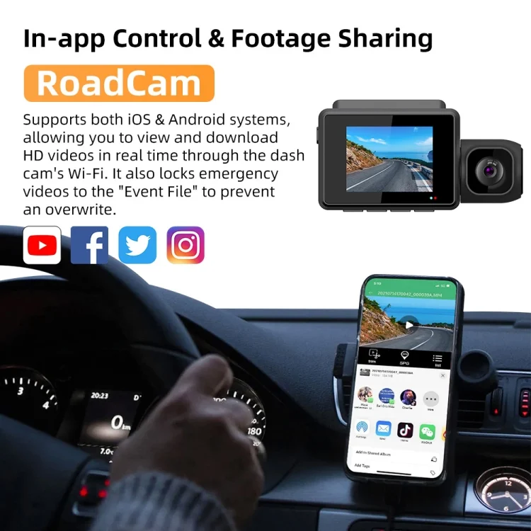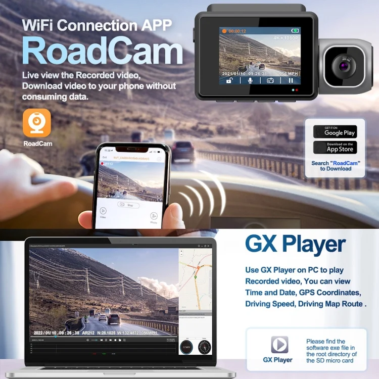 1. WiFi connection APP RoadGam, real-time view recorded video, download video to your phone without consuming data