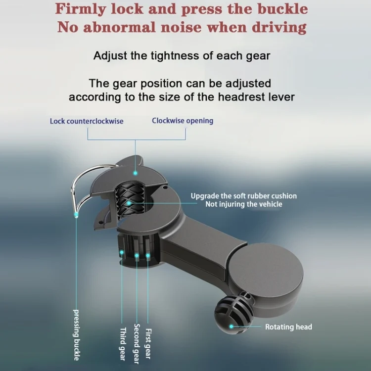 12. The tight lock and buckle are strong, and there is no abnormal noise when driving. There are three gears to adjust the tightness, and the gear can be adjusted according to the size of the headrest rod.