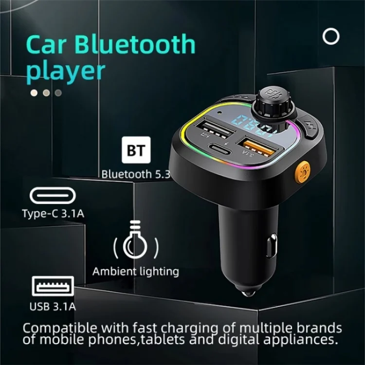 C6 Type-C+2 USB Fast Charger Audio MP3 Player Digital Display FM Car Bluetooth Transmitter