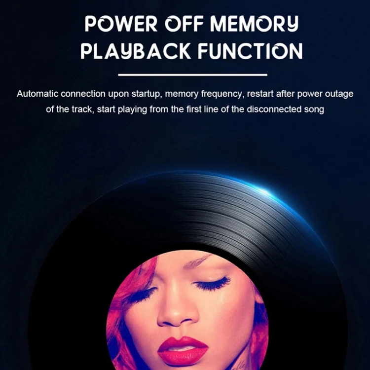 12. Power-off memory playback function: Automatically reconnects after power-on, memorizes frequency, and restarts the track after power-off from the first sentence of the disconnected song.