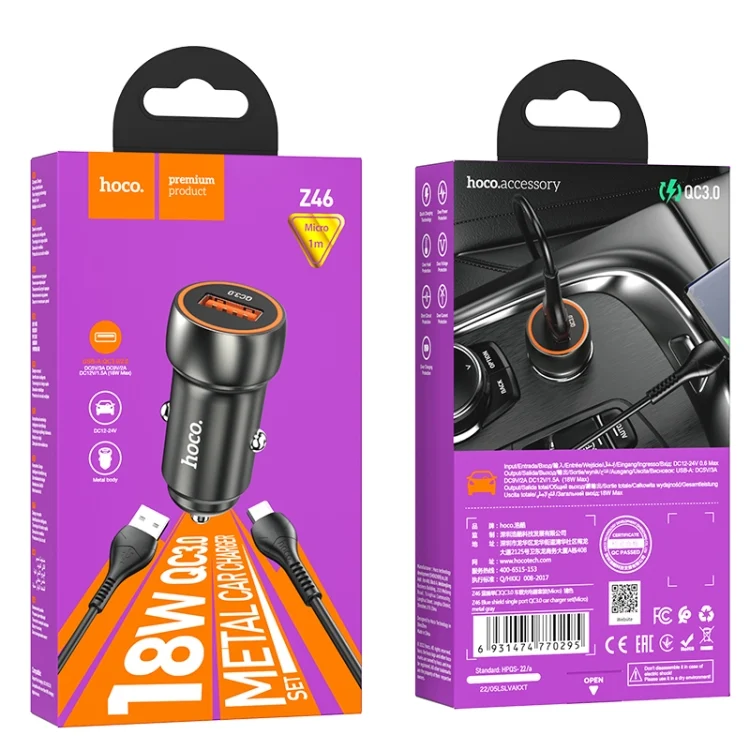 hoco Z46 Blue Shield Single Port QC3.0 Car Charger Set with Micro USB Cable – Qty: 5 Units