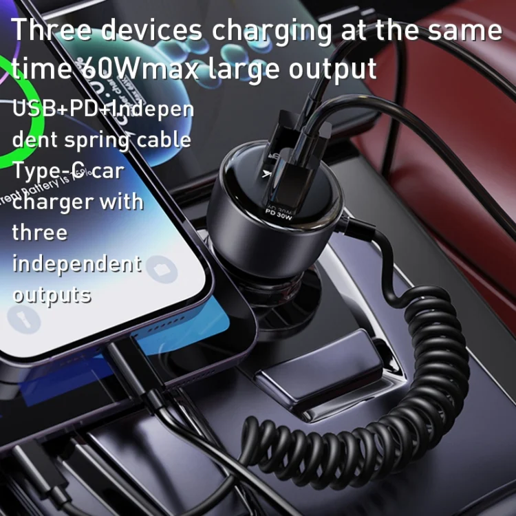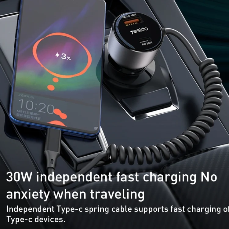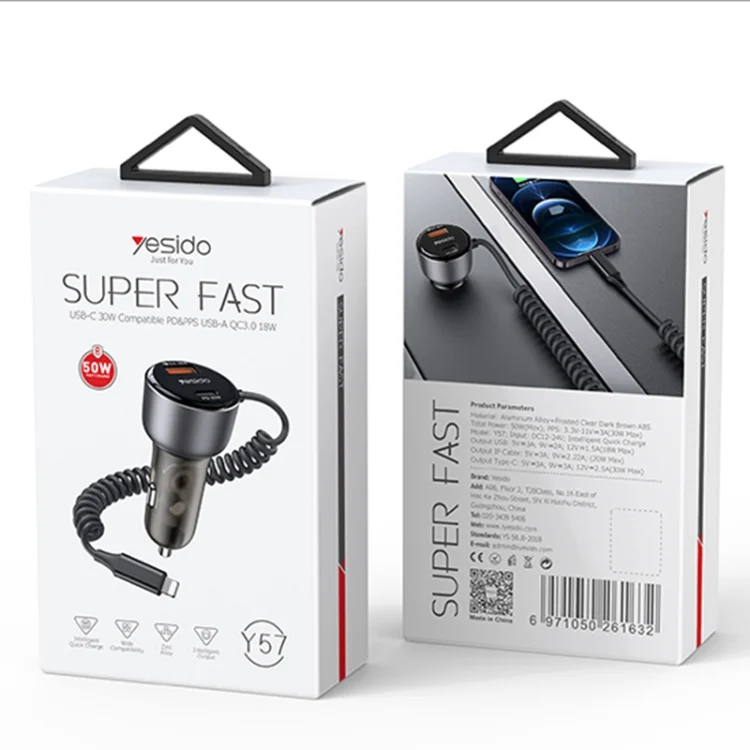 Yesido Y57 50W PD + QC3.0 Dual Port Car Charger with 8 Pin Spring Data Cable