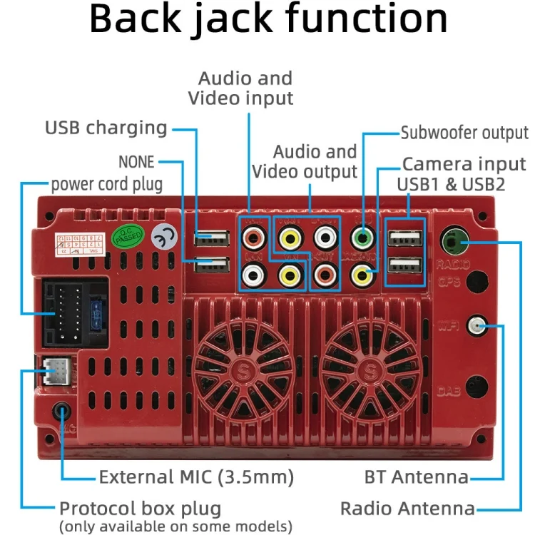 USB interface: front USB2.0 read (black) + rear USB2.0 read x2 (USB1 unavailable) + front 2.1A charging port (red) + rear 2.1A charging port + reserved test port
