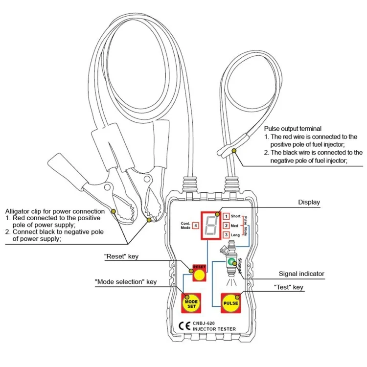 6. After the test is completed, if it is necessary to repeat the test, press the “Pulse” key again; if you want to change the pulse mode, press the “Reset” key, you can select the required mode at will, and then test the fuel injector again.