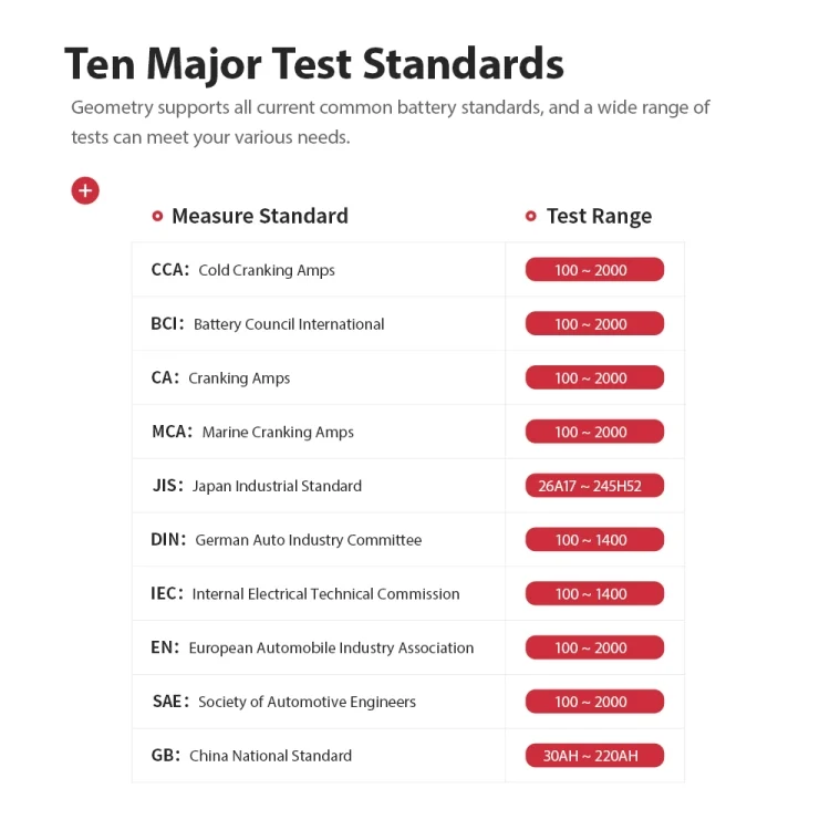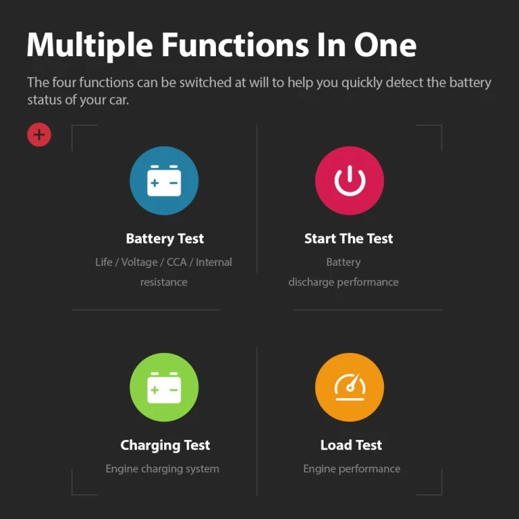 7. Four test function options: battery test (lifetime, voltage, CCA, internal resistance), startup test, charging test, load test