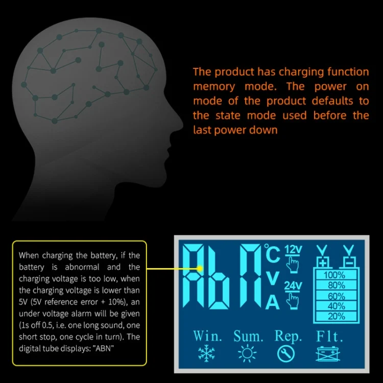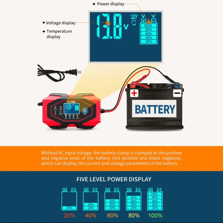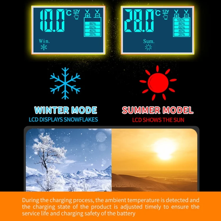 15. The portable battery charger/maintainer automatically detects the outside temperature and starts the winter and summer mode, and automatically selects the appropriate charging voltage according to the temperature