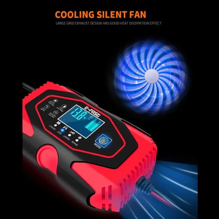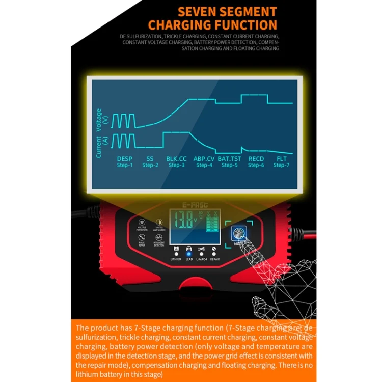 10. Fully automatic battery charger, suitable for most battery types, including lithium batteries, 12V-24V 6AH-120AH lead-acid batteries (GEL, AGM, WET, SLA, DEEP CYCLE)
