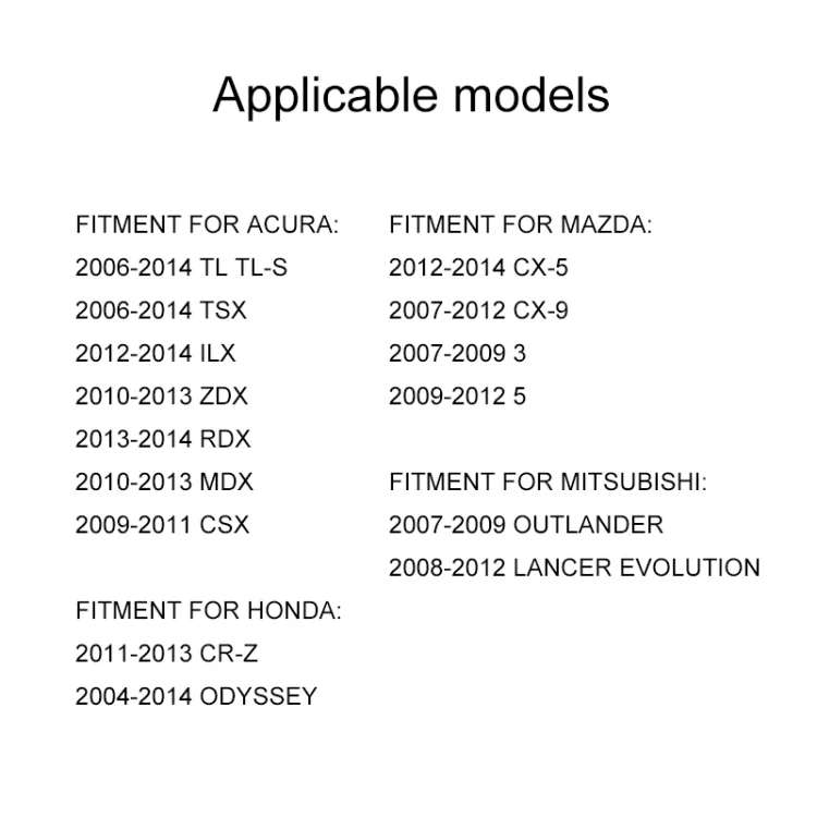 9. Applicable models: suitable for Honda Accord 8th generation, Odyssey 2004-2014, Civic, CRV, CR-Z 2011-2013, Acura TL TL-S 2006-2014, TSX 2006-2014, ILX 2012-2014, ZDX 2010- 2013, RDX 2013-2014, MDX 2010-2013, CSX 2009-2011, applicable to Mazda CX-5 2012-2014, CX-9 2007-2012, 3 2007-2009, 5 2009-2012, applicable to Mitsubishi Outlander 2007- 2009, Lancer Evolution 2008-2012