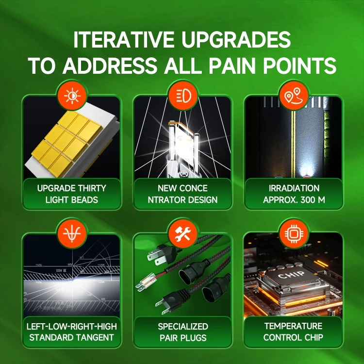 11. Double-layer copper substrate + built-in double copper tube heat conduction system, with hydraulic fan, the speed can reach 15000rmp, which can dissipate heat more efficiently and quickly, making the car lights run more stably, and greatly increasing the service life of LED car lights, the service life can reach more than 50000h 12. Use 12 3570-55mil ZES chip, with a power of up to 120W, provides you with up to 12000LM ultra-bright lighting, turning night into daytime and ensuring your driving safety